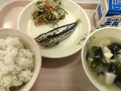 今日のメニューは、麦ご飯、牛乳、みそ汁、めざし、即席漬です。