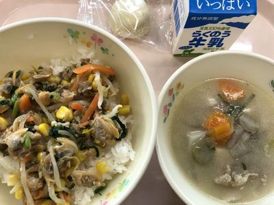 今日のメニューは、すし飯、牛乳、豚汁、あさりの彩り丼の具、いきなり団子です。