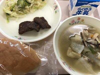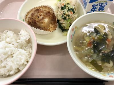 今日のメニューは、コッペパン、牛乳、栄養すいとん、鯨の竜田揚げ、ゆでキャベツです。