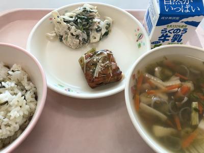 今日のメニューは、高菜飯、牛乳、あおさ汁、具入り豆腐あんかけ、レンコンサラダです。