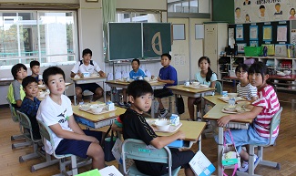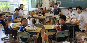 二人は、朝のあいさつ運動を行い、各クラスの授業に入ったり、一緒に給食を食べたり、昼休みに遊んだりしてくれました。