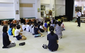 ホールに集合したあと、校長、及び防災担当より、子どもたちに話をしました。