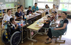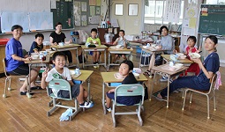 各学年の給食風景をみましたが、どの学年も親子で机を丸く囲んでの給食で、とても楽しそうでした。