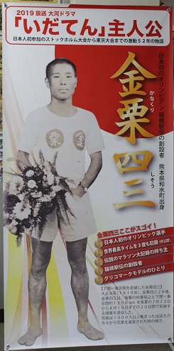 昨日の「いだてん」カウントダウン写真撮影に続き、本日は社会教育課より、金栗四三氏の等身大の巨大ポスターをいただきました。今、正面玄関に掲示しています。「いだてん」の放映が一日一日と近まってきており、町全体で機運が盛り上がってきています。来校された際には是非ご覧ください。