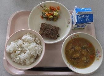 本日の献立は、麦ごはん、牛乳、じゃがいものそぼろ煮、いわしの千草焼き、白菜の昆布和えでした。いわしの千草焼きはいわしのすり身に具をまぜて焼いてあります。