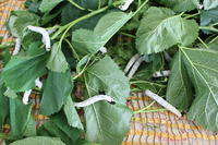 6月3日(月)、学校に「かいこ」が届きました。これは、担任の山口先生が、3、4年生の学習用に注文されていたもので、早速その日から、「かいこ」の飼育と研究がはじまりました。えさの「くわの葉」は、先生やこどもたちがもってきています。教室に入ると、テーブル上のくわの葉の上で、かいこが動いていますので、ちょっとびっくりします。早いものはすでにまゆになってしましました。また、もう糸をだしはじめているかいこもいますので、それはこどもたちが場所を移動させて、それぞれが個室に入るようにしています。さて、明日の朝には何匹がまゆの状態になっていることやら。