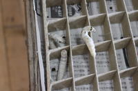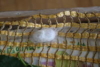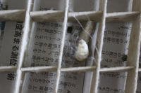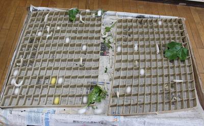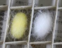 昨日から一夜明けたら、さらにまゆになっているかいこが多くなりました。それぞれ、自分の部屋をみつけ糸をはいてまゆになっていきます。黄色いのがメスで、白いのがオスとのこと。来週の月曜日には、すべてまゆになっていそうです。