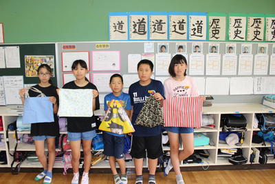 5,6年生の家庭科の授業で、5年生は小物入れ、6年生はトートバッグや巾着を作りました。一人一人創意工夫をし、自分で使えるものが制作できたようです。この写真のときは、まだ未完成の人もいましたが、現在は完成し、各自使っていると思います。