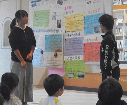 全校集会では、6年生が修学旅行で学んだことを発表してくれました。