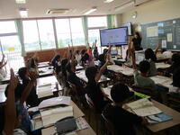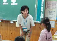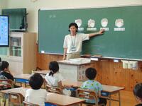 5年生が、総合的な学習の時間を使って「命を支える食」というテーマで米作りに挑戦しています。本日は、ご自身の田んぼを子どもたちの学習のために提供していただき、ご指導もしていただいている地域の方をお迎えし、米作りの流れや工夫及び苦労などを話していただきました。子どもたちだけでなく、先生方にも質問をしながら話を進めていかれるので、楽しみながら話を聞くことができました。天候による水の管理や様々な害虫の駆除、草刈りなどの苦労についても話がありましたが、「おいしいと言って食べてもらえることが一番うれしい」という話が印象に残りました。また、菊陽の田の水が地下にしみこみ、時間をかけて江津湖に湧き出し、熊本の水を支えていることには、子どもたちも驚いていました。菊陽の水田が、熊本県の自然を守る重要な役割を果たしていることを知った子どもたちは、自分たちのふるさとをさらに誇りに感じたことでしょう。10月には、稲刈りが待っています。子どもたちも、その日が来ることを楽しみにしているようでした。