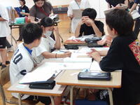 お年寄りの方や視覚に障がいを持たれている方、車いすを使われている方の疑似体験を行うとともに、その方々をどのようにサポートすればよいかを学んでいきました。「思うように体が動きません」「アイマスクをしていると見えないので、階段がこわかったです」「車いすで坂道を下るときは、ドキドキしました」という声が聞かれました。また、サポートする子たちは、「本当にこれでよいのか、心配でした」「力が入りました」などの感想を話していました。