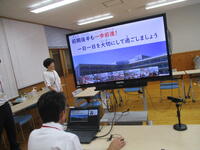 各教室をオンラインで結んだ児童集会が行われました。いつも配信を行っている大会議室で見せてもらっているのですが、集会を盛り上げるために最初に登場した2人の子どもたちの様子に、思わず大笑いしてしまいました。「おはようございます」と話すと、カメラに向かって耳を澄ませます。教室からあいさつが返ってくるのですが、「まだまだ、おはようございます!」と、同じ動きを3回ほど繰り返しちると、最初とは比較にならないぐらいの「おはようございます」が響き、学校全体が一気に元気になったようでした。また、情報委員会からタブレットPCの使い方について、クイズを交えながら紹介がありました。発表の中で、「みんなが使っているタブレットは、町から貸してもらっているものなので、勉強のためだけに使い、大切にしましょう」という内容がありました。発表を教室で聞いている子どもたちにも、しっかり伝わったことでしょう。