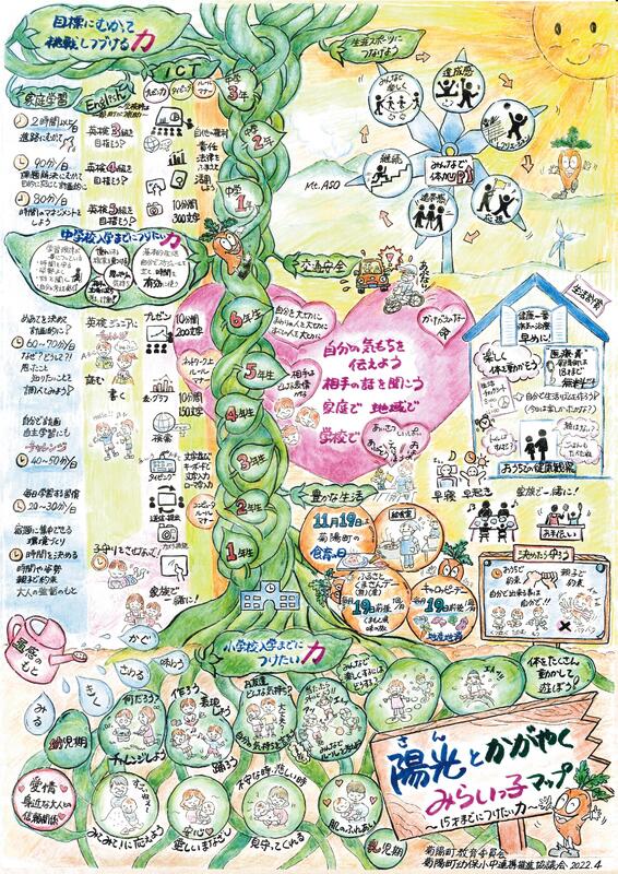 菊陽町幼・保、小、中連携推進協議会で「育ちのマップ『陽光とかがやくみらいっ子マップ ~15才までにつけたい力~』」が作成されました。