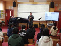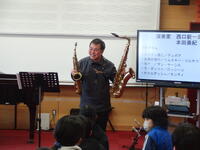 菊陽町では、音楽家の派遣事業として、小学校を中心とした地域の人たちにプロの演奏家を派遣し、一流の芸術音楽を体験するアウトリーチ活動が行われています。本校では、6年生を対象に音楽に親しむ時間としています。学級ごとに演奏していただきましたが、本日が最終日でした。サックスとピアノの演奏家の方をお迎えし、楽器の紹介や音楽の楽しみ方など、途中でクイズ等を交えながら伝えていただきました。目を閉じて情景を思い浮かべたり、演奏家の方と一緒に合奏したりしながら、楽しい時間を過ごすことができました。今回のアウトリーチ活動を通して、さらに音楽に興味をもって子も多いのではないかと思いました。
