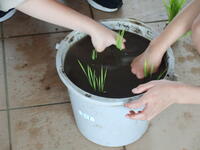 5年生が総合的な学習の時間で、バケツ稲でお米を育てる取組に挑戦します。本日、グループごとに苗を植えました。植える前に、苗作りからお世話になっている地域学校協働活動推進員の方から、植え方についての説明をいただきました。その中で、苗作りにご協力いただいた地域の方の実演動画を視聴しました。この動画も地域学校協働活動推進員の方が用意され、本当に有り難く感じました。