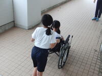 お年寄りの方や視覚に障がいを持たれている方、車いすを使われている方の疑似体験を行うとともに、その方々をどのようにサポートすればよいかを学んでいきました。「思うように体が動きません」「アイマスクをしていると見えないので、階段がこわかったです」「車いすで坂道を下るときは、ドキドキしました」という声が聞かれました。また、サポートする子たちは、「本当にこれでよいのか、心配でした」「力が入りました」などの感想を話していました。