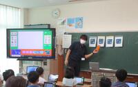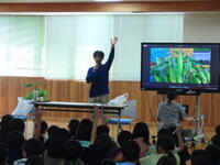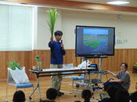 5年生が、総合的な学習の時間を使って「命を支える食」というテーマで米作りに挑戦しています。本日は、ご自身の田んぼを子どもたちの学習のために提供していただき、ご指導もしていただいている地域の方をお迎えし、米作りの流れや工夫及び苦労などを話していただきました。子どもたちだけでなく、先生方にも質問をしながら話を進めていかれるので、楽しみながら話を聞くことができました。天候による水の管理や様々な害虫の駆除、草刈りなどの苦労についても話がありましたが、「おいしいと言って食べてもらえることが一番うれしい」という話が印象に残りました。また、菊陽の田の水が地下にしみこみ、時間をかけて江津湖に湧き出し、熊本の水を支えていることには、子どもたちも驚いていました。菊陽の水田が、熊本県の自然を守る重要な役割を果たしていることを知った子どもたちは、自分たちのふるさとをさらに誇りに感じたことでしょう。10月には、稲刈りが待っています。子どもたちも、その日が来ることを楽しみにしているようでした。