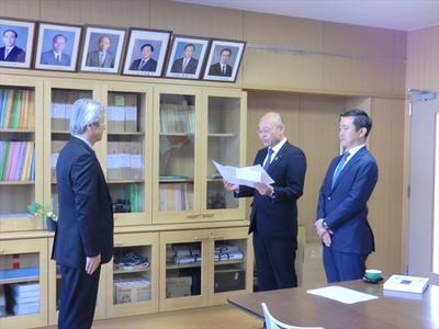 肥後銀行の方と社長さんからいただいた備品の目録を読み上げてもらっています。