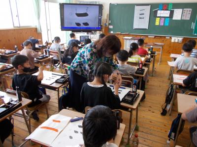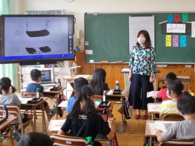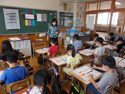 3年生の書写(毛筆)の授業に、校区で書道を教えておられる藤原(ふじはら)三恵子先生に来ていただきました。