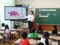 県立技術短期大学の方の協力を受け、3年生がプログラミングについて学ぶ授業を行いました。立方体のキューブを指令に合わせて動かすキットを使い、楽しく学ぶ様子が見られました。最初に「一歩前へ」や「右に曲がる」といった動き方が書かれたカードを何枚か並べ、その上をキューブが動くことで動き方を記録します。動き方を示した本のスタート位置にキューブを置くことで、描かれた道に沿って指令通りにキューブが動いていきます。指示通りに動かないこともありましたが、自分たちで考えながら楽しく学んでいました。自分が意図する一連の活動を実現するために、どのような動きの組合せが必要か、どのように組み合わせたらいいのか、どのように改善していけば、より意図した活動に近づくのかといった物事を論理的に考える力を育むうえで、とても良い取り組みだと感じました。
