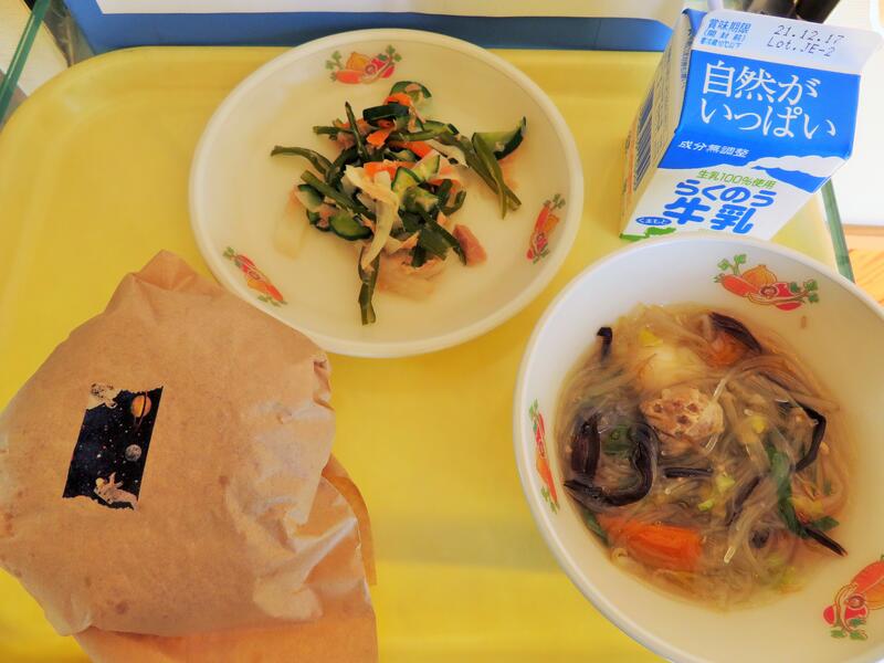 今日のメニュー あげパン、春雨スープ、茎ワカメのサラダ、牛乳