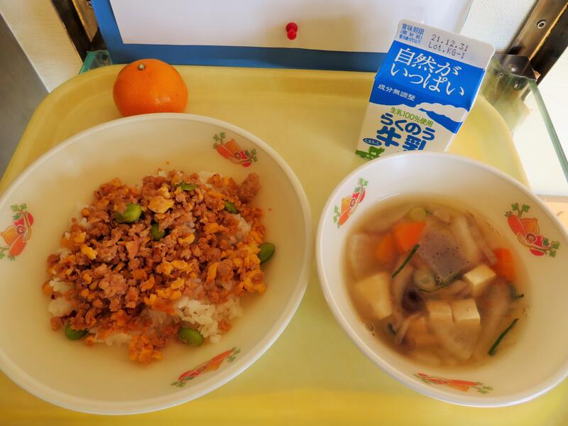 今日のメニュー そぼろ丼、けんちん汁、みかん、牛乳