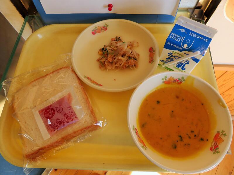今日のメニュー 食パン、いちごジャム、かぼちゃのポタージュ、れんこんサラダ、牛乳