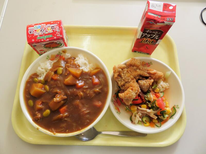 りんごジュース、カレーライス、からあげ、サラダで元気、クリスマスケーキ