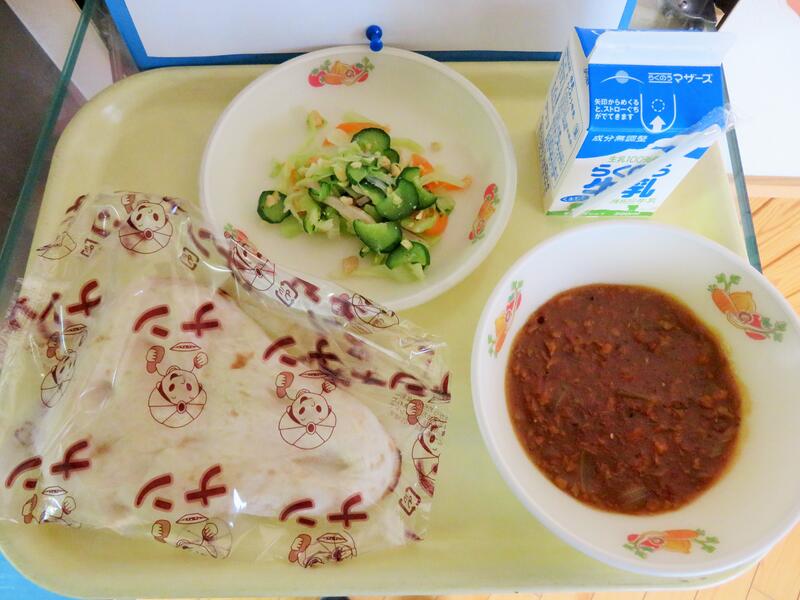 冬休みも終わり、今日から後期後半が始まります。今日1月11日は鏡開きです。鏡開きとは、お正月に神様や仏様にお供えした鏡餅を下げて、神仏に感謝の気持ちを示し、無病息災を祈って鏡餅を食べる日です。今日は、鏡開きにちなんで、雑煮やぜんざいなどお餅のメニューのところですが、冬休み明け初日の給食なので、学校に来るのが楽しみになるメニューにしました。お餅のメニューは後日登場しますよ。今日は、あげパンに並ぶ人気メニューのナンとキーマカレーです。ナンは、インドやイランなどでよく食べられる平らなパンのことで、強力粉に塩、砂糖、イーストなどを加え発酵させた生地を薄くのばし、つぼ型のかまどの内面にはりつけて焼いたものです。本場や専門店ではかまどで焼きますが、フライパンで焼くこともできるので、お家でナンを手作りすることもできますよ!たくさん食べたい人、お料理好きの人は挑戦してみてくださいね!