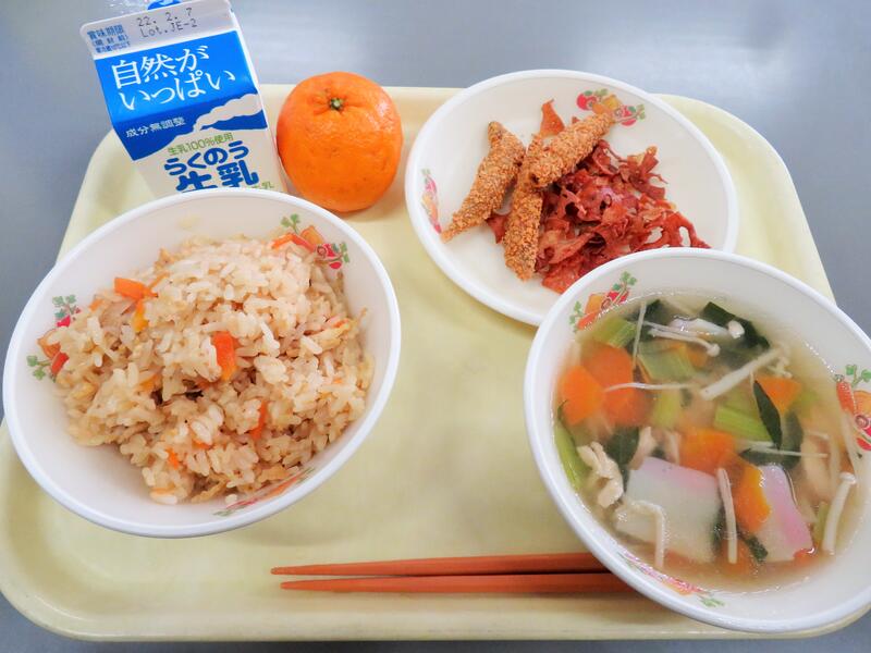 今日のメニュー びりん飯、白玉汁、きびなごフライとれんこんチップス、ぽんかん、牛乳