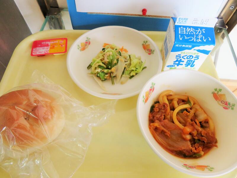 今日のメニュー 火の国パン、ジャム&マーガリン、キムチうどん、 ごぼうとツナのサラダ、牛乳