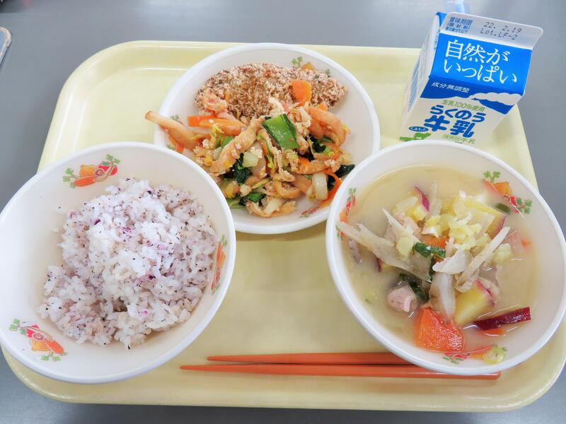 今日のメニュー もち麦ごはん、豚汁、真鯛青のりフライ、切干大根の煮物、牛乳