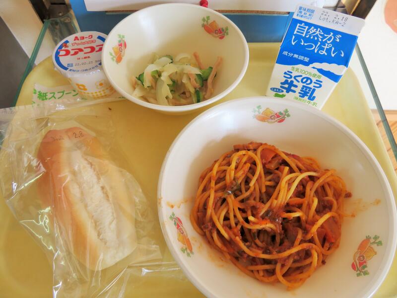 今日のメニュー ソフトフランスパン、スパゲッティミートソース、ヤーコンサラダ、ヨーグルト、牛乳