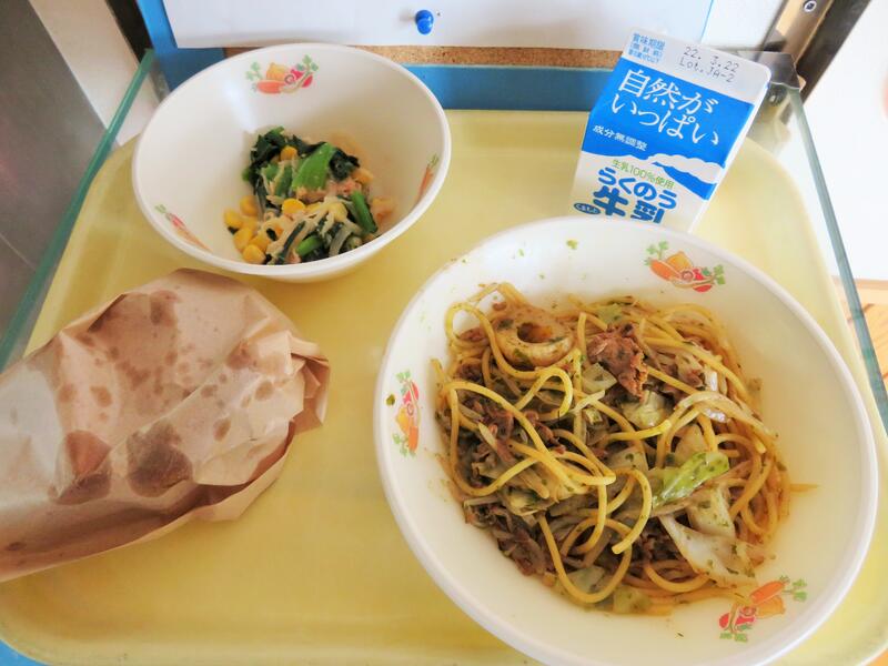 ミルクパン、スパゲッティナポリタン、ひじきとツナのサラダ、はるか、牛乳