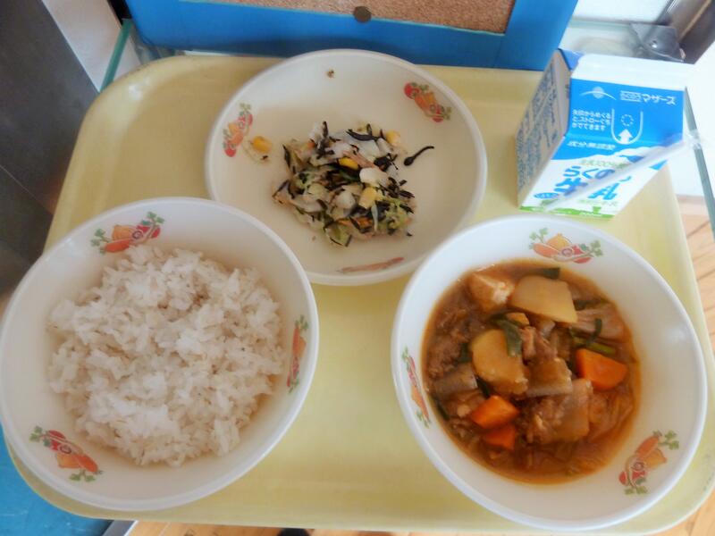 今日のメニュー 麦ごはん、じゃが豚キムチ、ひじきサラダ、牛乳