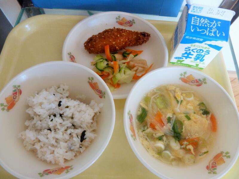 わかめご飯、かきたま汁、あじごまフライ、即席漬け、牛乳