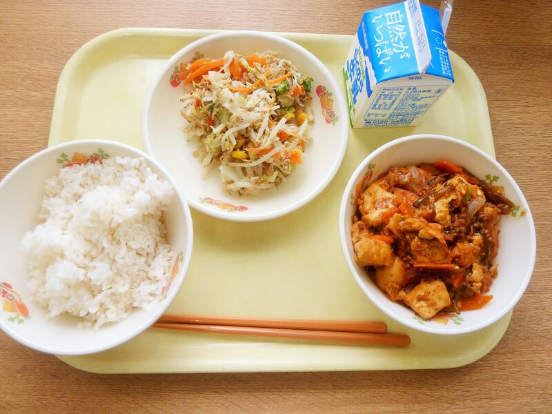 麦ごはん、あつあげの四川風煮、オクラのごまサラダ、牛乳