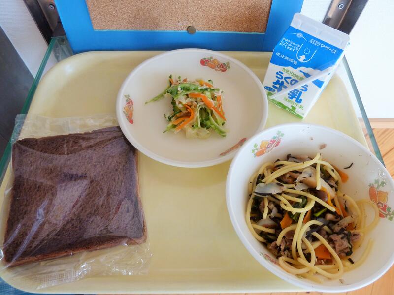 ココアパン、和風スパゲッティ、ゴーヤサラダ、牛乳