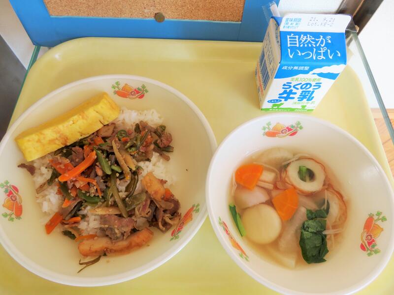 今日のメニュー きんぴらどん、お月見汁、厚焼卵、牛乳