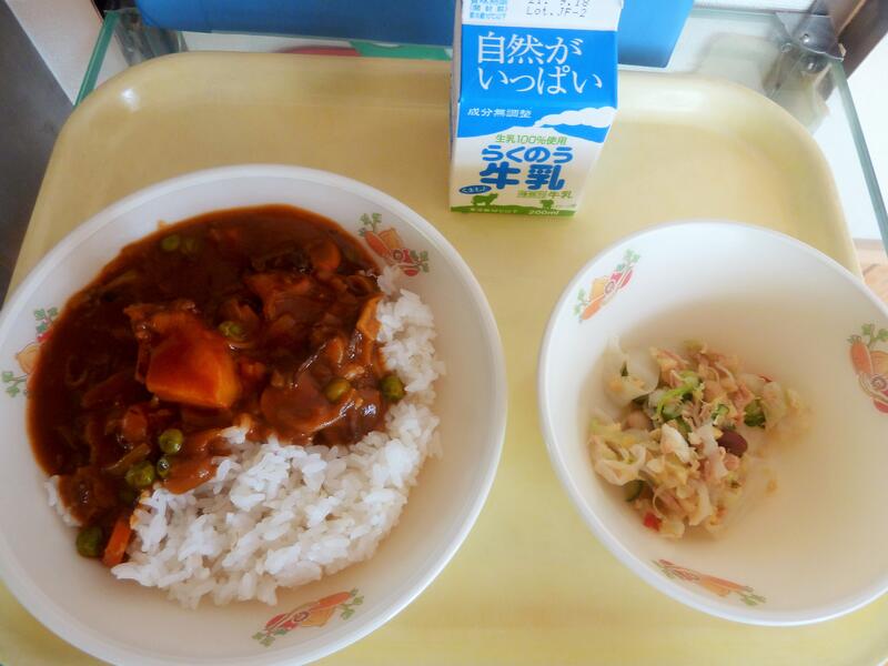 今日のメニュー ミルクパン、カレーうどん、白菜とりんごのサラダ、牛乳