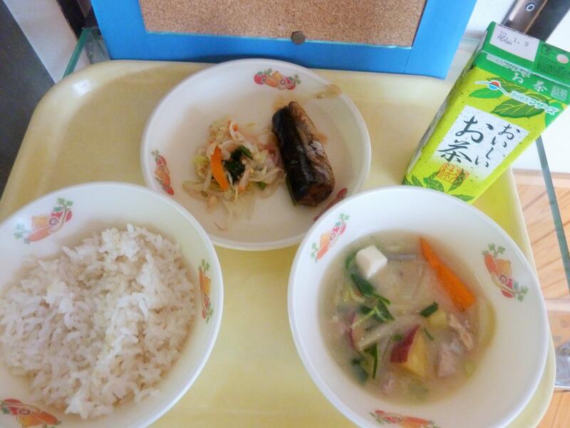 麦ごはん、さつま汁、さんまの梅煮、土佐酢和え、緑茶