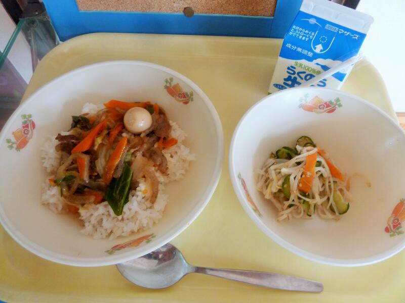 英語でhustle(ハッスル)の意味は、「ゴリ押しする」、「乱暴に押しのけて進む」など強引な感じですが、日本語では、「張り切る」、「とにかく頑張る」というポジティブな意味で使います。ハッスル丼には、豚肉、人参、たまねぎ、こんにゃく、うずらの卵、たけのこ、ねぎなど元気が出る食材がたくさん入っています。しっかり食べて午後からもハッスルしましょうね!9月は残滓を減らすことを目標にして献立を工夫したり、1,2年生の給食を運搬したり、頑張っています。嬉しいことに、前期前半に比べると、残滓も1/5ぐらいに減りました。苦手な食べ物がある人もいると思いますが、少しだけ頑張って食べるように努力してみましょうね!