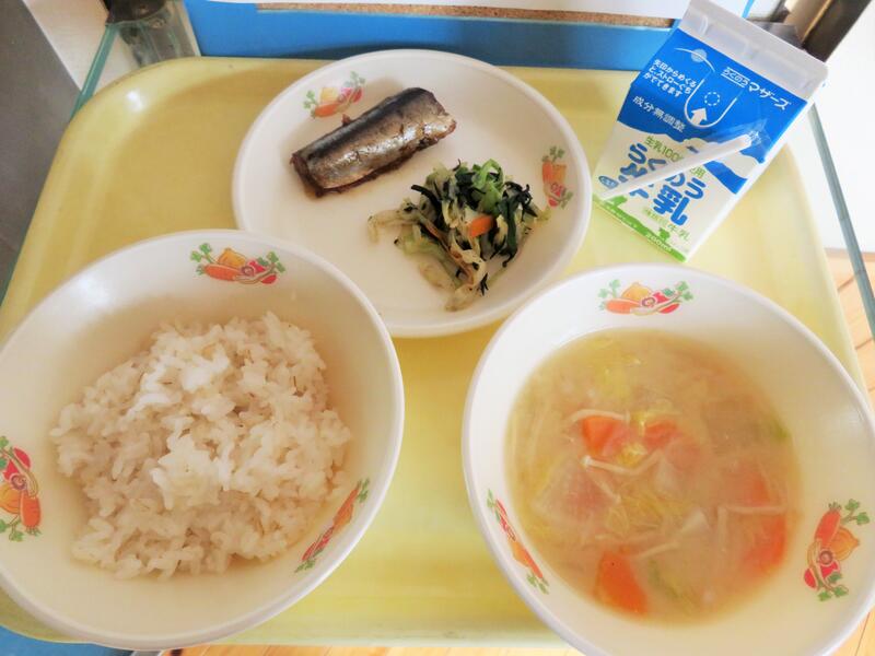 麦ごはん、冬野菜のみそ汁、さんまのみぞれ煮、ひじき和え、牛乳