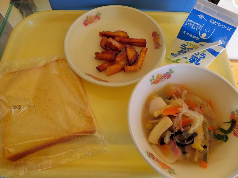 今日のメニュー テーブルロール、タイピーエン、大学いも、牛乳