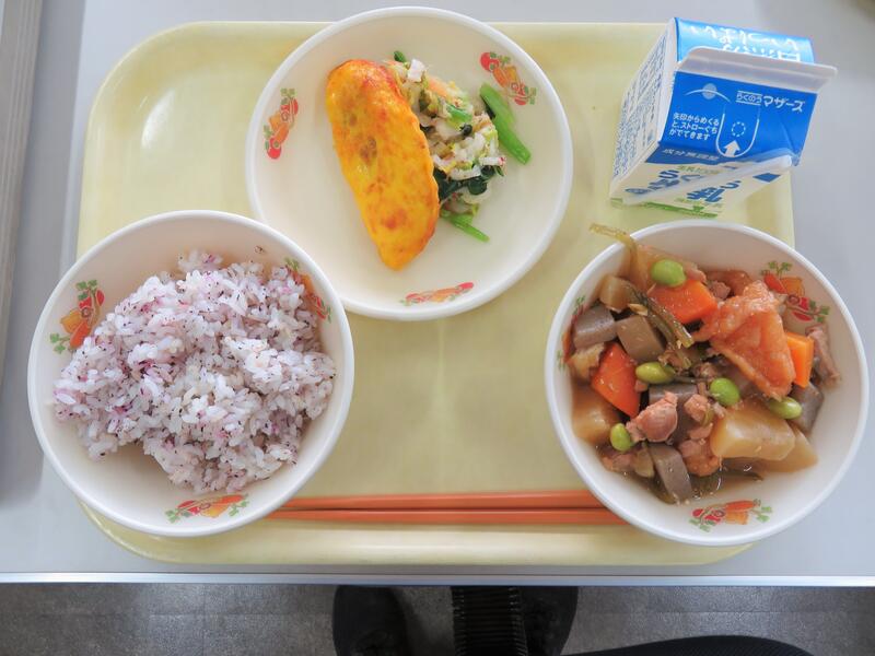 いつもは、米と麦の麦ごはんですが、今日はもちきびを加えた三穀ごはんです。もちきびはイネ科の雑穀で、穀物の中で一番低カロリーといわれ、良質なたんぱく質、ミネラルを含む優れた食材で、特に鉄分、亜鉛、マグネシウムが多く含まれています。甘みがあって粘りが強いので、いつもの麦ごはんにもちきびを加えることで、ヘルシーでおいしくなります。寒くなり、さといもを使うメニューが多くなりました。さといもは、皮をむいたものを買うこともできるのですが、コストとおいしさにこだわって、北小では給食室で皮むきからしています。今日のさといもサラダも、15キロのさといもを皮むきして作りました。さといもは苦手という人にも、さといものおいしさが少しでもわかってもらえると嬉しいです。もりもり食べて今週もがんばりましょう!