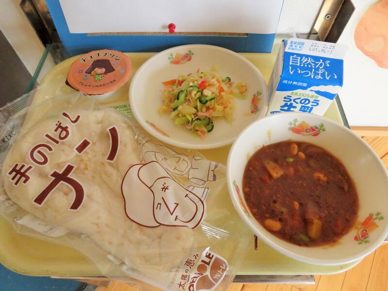 今日はみなさんからのリクエストが多いナンとカレーです。今日のカレーはヘルシーで栄養たっぷりの大豆カレーです。インドは豆が豊富な国です。肉を使わない「豆のカレー」は、材料費もリーズナブルであり、ベジタリアンの人も食べられるので「インドの国民食」と言われるほどの定番メニューなのだそうです。豆が苦手という人もいるかもしれませんが、今日の大豆カレーはお肉も使ってキーマカレー風になっているので、豆嫌いの人もおいしく食べられますよ!今日はバレンタインデーなにちなんでチョコプリンをつけています。今日はデザートも嬉しいお楽しみメニューですね!