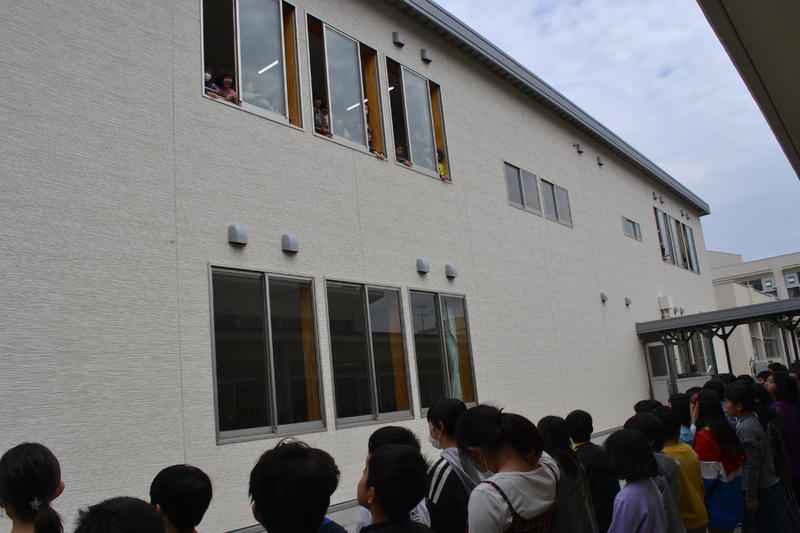 ↓ 6年生の教室に向かって在校生が大合唱 ↓教室の下を見てびっくりの6年生