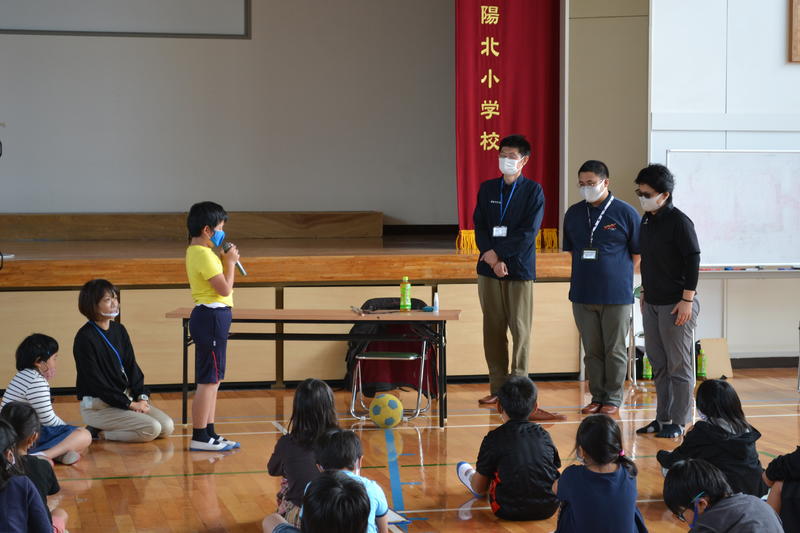 実施については、教頭先生のアイディアで「ふれあいの森研修センター運営委員会」と「北小校区区長会」が行われる22日にしようということで決定しました。6年生は運動会後もソーラン節の練習をかさね、ついに22日に披露することができました。当日は雨で、ふれあいの森公園での披露ができなくなり、本校の体育館で披露しました。