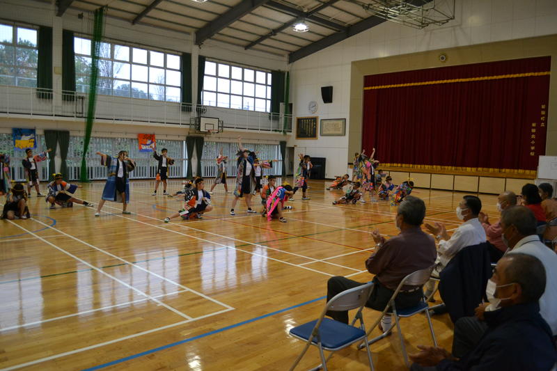 10月22日(木)の午後2時から、6年生が地域の方にソーラン節を体育館で披露しました。これは、運動会が各家庭2名までという制限があり、日頃お世話になっている地域の方々に公開できませんでした。あるご家庭で「ソーラン節見たかったな」と地域の方がつぶやいておられましたと聞き、6年生担任が、登下校の見守りでお世話になっている区長さんや民生委員さんにソーラン節を披露しようということになりました。
