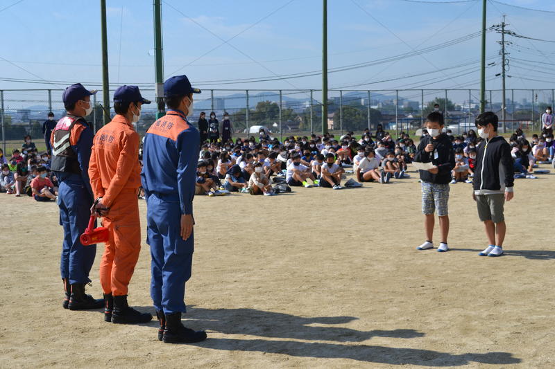 また、昨年度の反省に基づき、階段を使っての避難をせず、遠回りですがグランドに向かうスロープで避難をしてみました。多少時間がかかりましたが、だれ一人駆け出すこともなく、整然と避難することができました。消防署の方からもとても静かに避難できたことをほめられていました。(写真は、消防署の方にお礼を言う6年生(宮崎君と紫藤君)